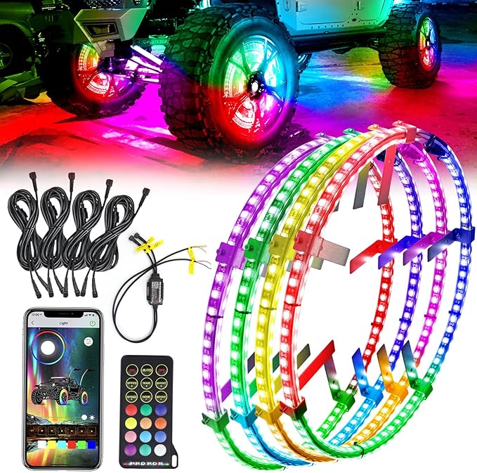 Included Components | 4PCS 14" Double Sided RGB LED Wheel Ring Lights with APP & Remote Control |