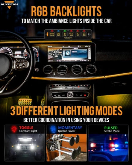 - RGB Backlight - Unlimited color options match dash lighting and vehicle