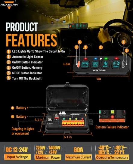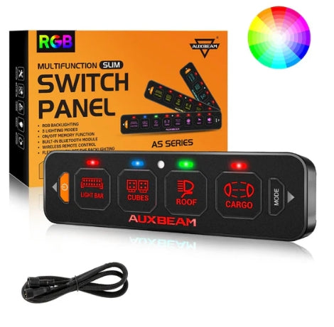- 4/6-Gang one-sided outlet switch panel. It allows you to control up to 4/6 different LED lights or devices. Command all your vehicle accessories by the tap of your finger.