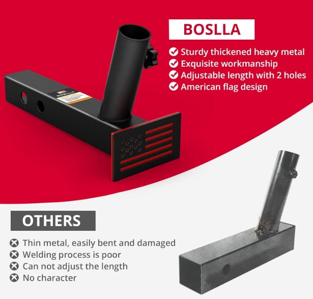 - PERFECTLY DISPLAY FLAGS: The flag pole holder for truck is designed with 2 holes to adjust the length to meet different needs. 110° tilt angle design makes the flag fly more fluttering. Boslla tow hitch flag pole holder kit can perfectly display your national flag, team flag etc, suitable for car shows, sports events, off-road riding and more.