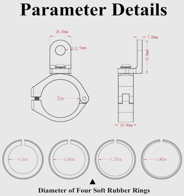 • Kit comes with four sizes of rubber ring inserts to provide a snug fit and protect the mounting surface. Rubber ring diameters: 1.5" (38.1mm), 1.65" (41.91mm), 1.75" (44.45mm), 1.85" (46.99mm). The rubber ring can be increased or decreased according to the diameter of the round rails. The tube clamp have a 2" (50.8mm) diameter mounting hole when without the rubber ring insert