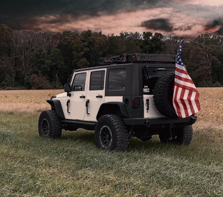 The Judge Flag Mount fits on the spare tire of your Wrangler giving you a place to mount any standard 1" flag pole so you can let a flag fly as you ride on the trails or the highway. This mount easily fits most wheel and tire sizes and is made from aluminum for strength and durability. If you are using this on a Wrangler JL you will need to purchase the optional JL Adapter bracket to relocate your factory camera.