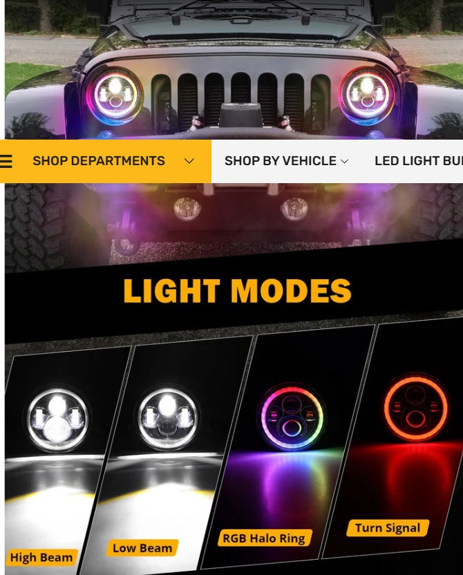 Upgraded 7 Inch Round LED Headlight with RGB Halo Ring for Jeep Wrangler JK TJ LJ