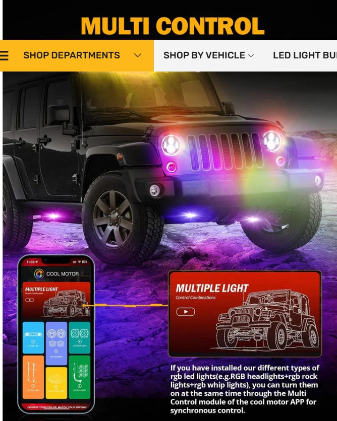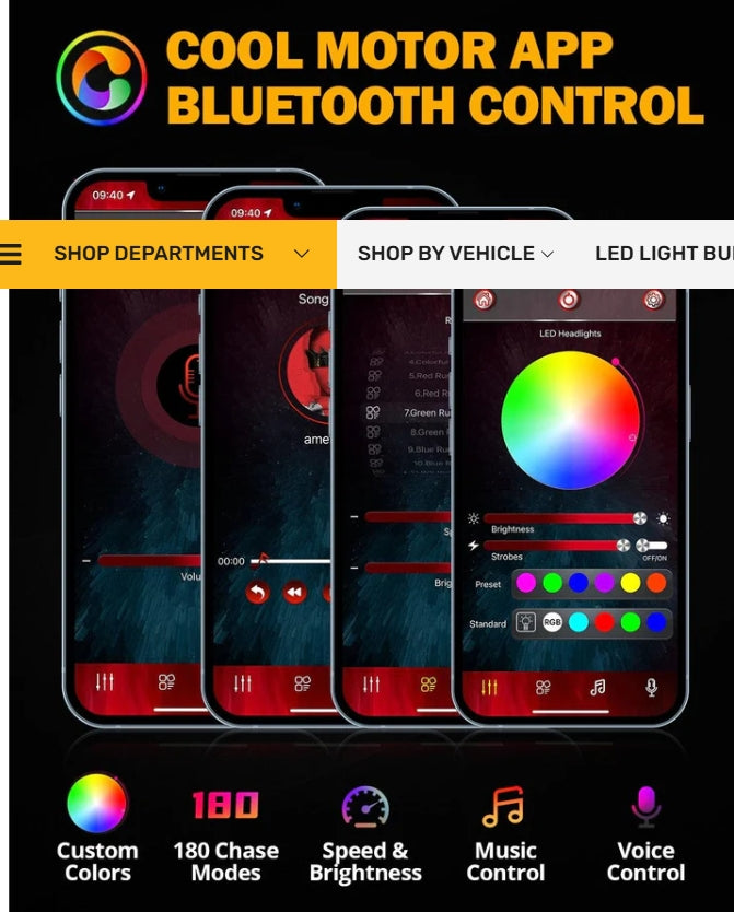 Exclusive Cool Motor APP: The program can not only connect multiple sets of RGB headlights, but also connect different types of RGB lights (whip lights, rock lights, etc.). (Only Cool Motor APP versions of RGB lights are supported.)