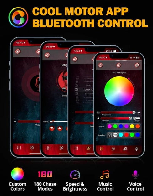 Exclusive Cool Motor APP: The program can not only connect multiple sets of RGB headlights, but also connect different types of RGB lights (whip lights, rock lights, etc.). (Only Cool Motor APP versions of RGB lights are supported.)
