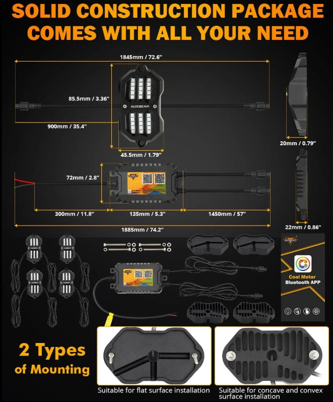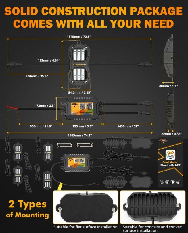 - Exclusive Cool Motor APP: The program can not only connect multiple sets of RGB rock lights but also connect different types of RGB lights (whip lights, headlights, etc.). (Only Cool Motor APP versions of RGB lights are supported.)
